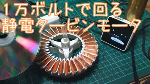 コロナモータです。 ロータはCDディスクです。 フツーのモータのような磁力は使いません。 静電気の力で回ります。 これもデンソー夢卵展示で出そうかな お客さんには触らせられないけど 冬になると、セーターとかがパチパチ鳴って まとわりつく・・・ そ…